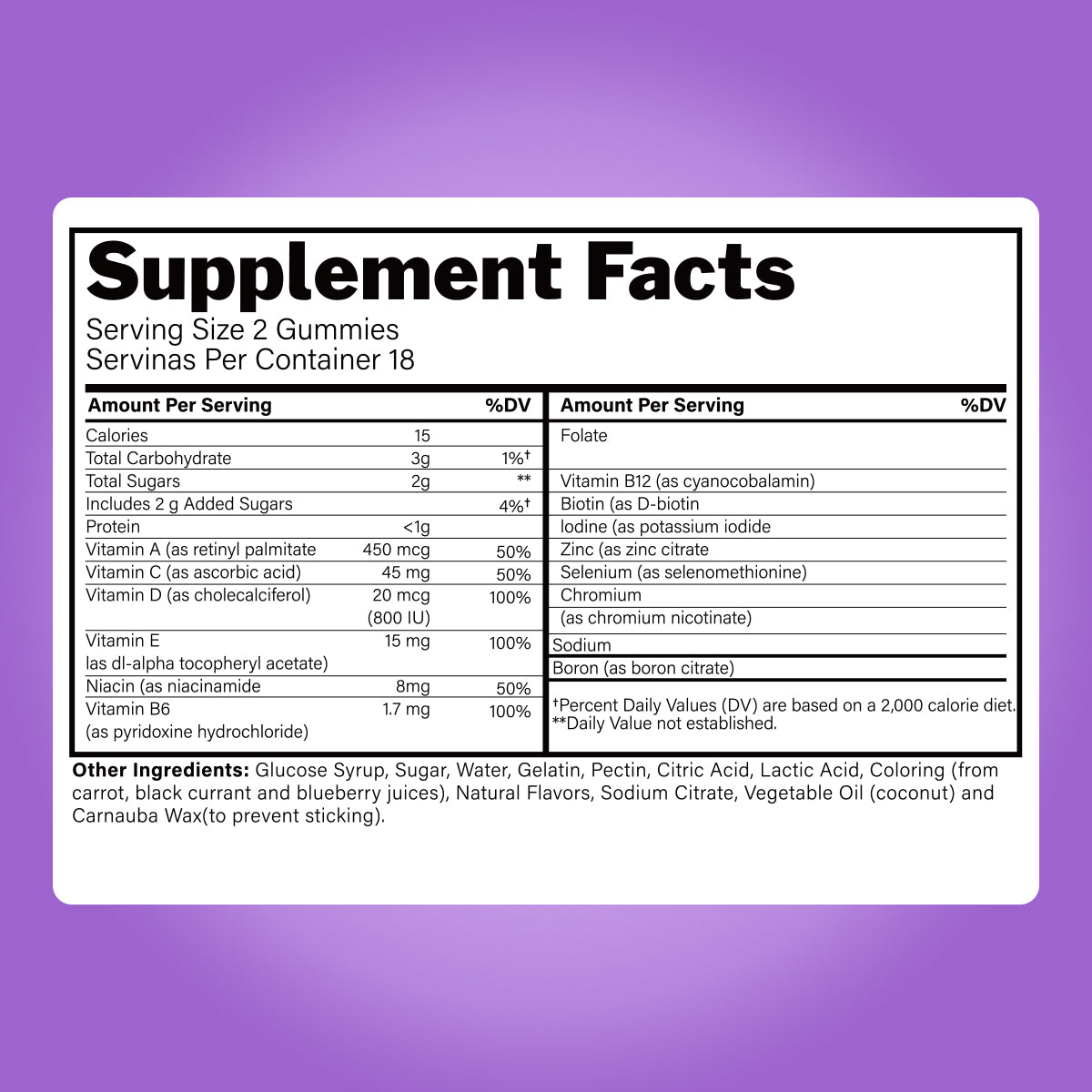 - A multitasking blend of Vitamins A, C, D, E, Bs, Biotin & Folic Acid